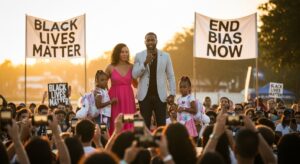 The crowd roared, their applause thunderous, banners waving—Black Lives Matter, End Bias Now. Zoe clutched her keychain, her voice small but brave as she spoke, coached by Susan. “I just wanted to go on vacation,” she said, her pigtails swaying, her eyes shining. “Why didn’t they like us?” Lila nodded, her whisper amplified. “We weren’t bad.” The crowd’s cheers softened to murmurs, their empathy palpable, Susan’s eyes glistening, her hand tightening, Michael’s arm around them, his pride a fortress.